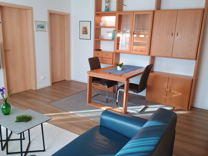 Im Wohnzimmer erleben Sie innenbeleuchtete Schrankwände, exklusive Ledercouches, einen Essplatz, einen Smart-TV, eine Musikanlage, W-Lan und zahlreiche Bücher. Sie finden dort ebenso Exkursionsbücher (Burgen, Höhlen, Biergärten, Wanderungen etc.)